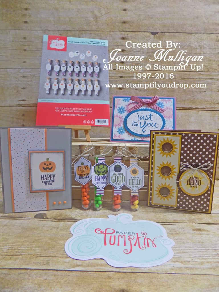 Here is the adorable Paper Pumpkin kit for September 2016 – Something Good to Eat. It comes with the supplies you need to make 16 treat tubes you can fill with Halloween goodies. It