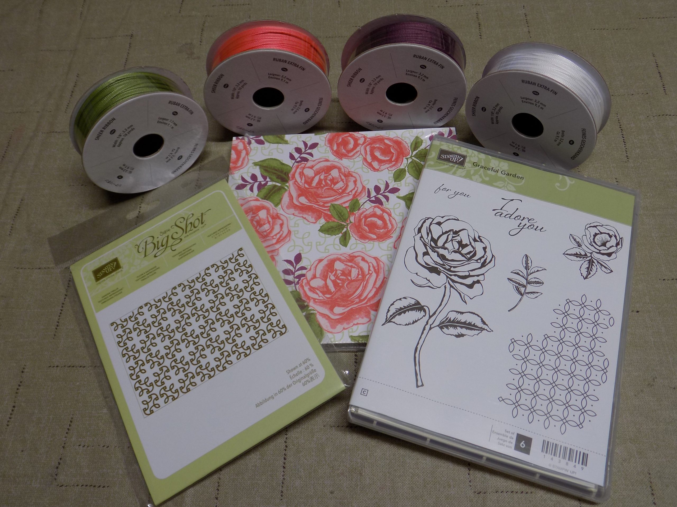 Nothing is more exciting than placing that first order from the new catalog. After looking at it every night for a month before going to bed (as you know that assures visions of stamps and ink dancing around in your head). Not to mention all the drooling over the new stamps, toys and my personal weakness; ribbon. Then on June 1st we get the green light to order anything from the catalog. Of course the first order is never easy. I have written my list of must haves and changed it so many time I have lost count. And I as was placing that first order I had to keep shifting things around to get the most bang for my buck.